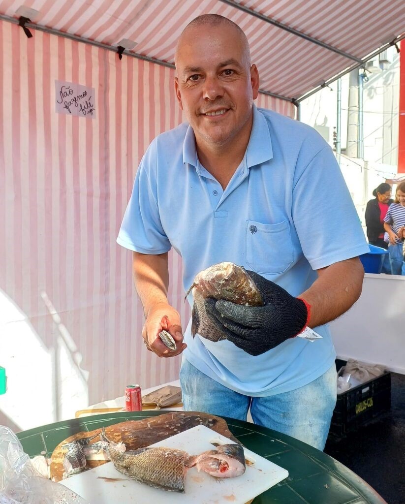 O piscicultor vendeu mais de 400kg de tilápia em poucas horas durante a Feira de Extrema, celebrando a oportunidade de estar na Feira de Extrema